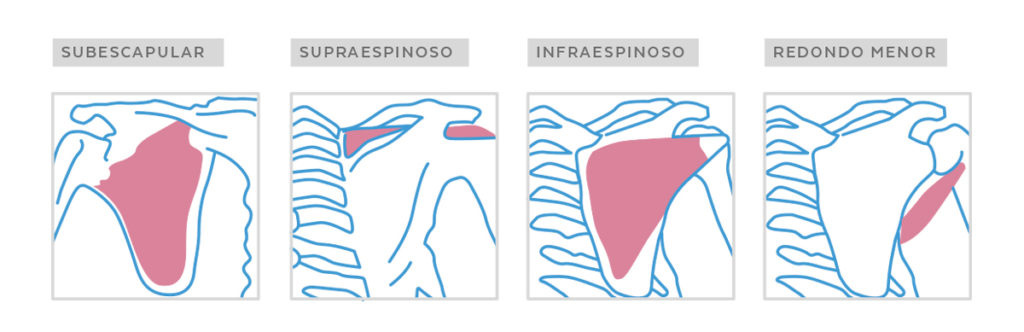 Está formado por cuatro músculos: subescapular (se inserta en la tuberosidad menor del húmero), supraespinoso, infraespinoso y redondo menor (se insertan en la tuberosidad mayor del húmero).
