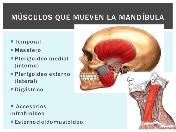 • Los músculos más importantes relacionados con la articulación son los maseteros, temporales, pterigoideos y digástrico. Tiene un papel accesorio también el esternocleidomastoideo.