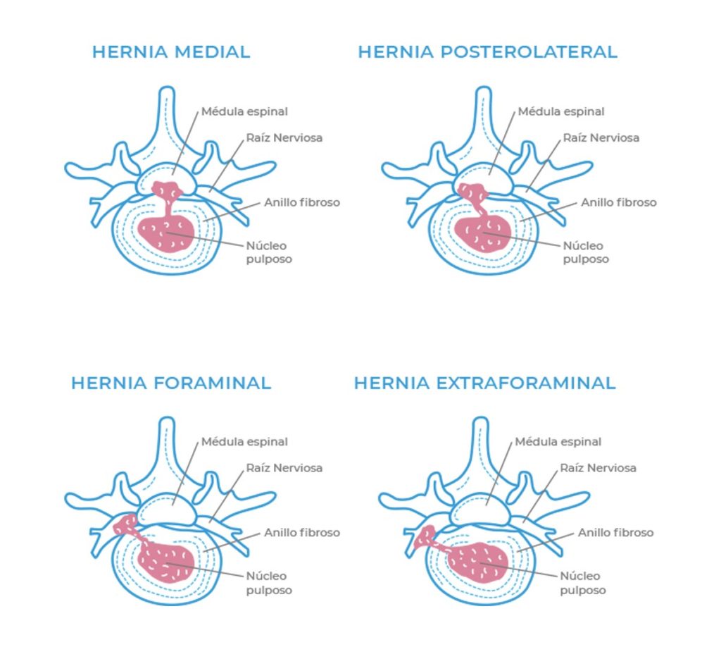 No todas son iguales en etiología y sobre todo se diferencian en los síntomas que producen. Las clasificaciones de las hernias discales más conocidas dependen de la localización de esta y de la relación que el núcleo pulposo tenga con el anillo fibroso del disco.