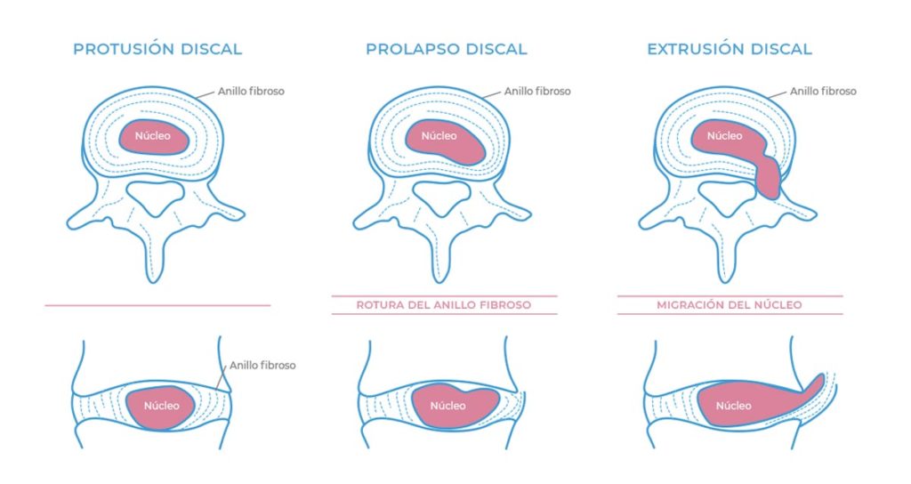 - Extrusión discal: el anillo fibroso está completamente dañado dejando que el núcleo salga fuera del límite del disco vertebral.